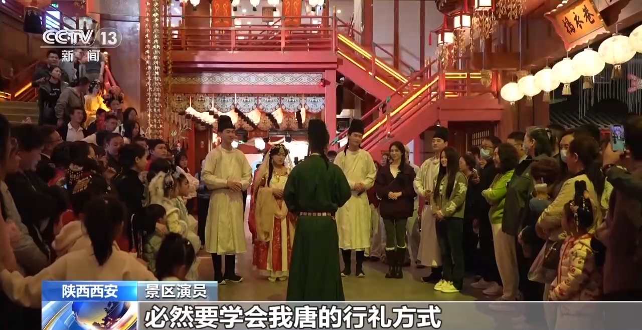 上午10点,西安以“唐文明”为主题的街区刚刚敞开全天的表演,就迎来了8000多名游客。古色古香的街巷里,身穿唐代服饰的艺人们顺次上演着“百官迎宾”“万邦来朝”等沉溺式演艺节目。